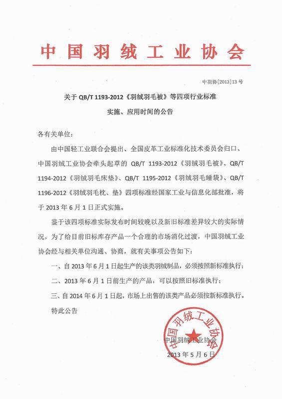 關(guān)于QB T 1193-2012《羽絨羽毛被》等四項(xiàng)行業(yè)標(biāo)準(zhǔn)實(shí)施、應(yīng)用時(shí)間的公告